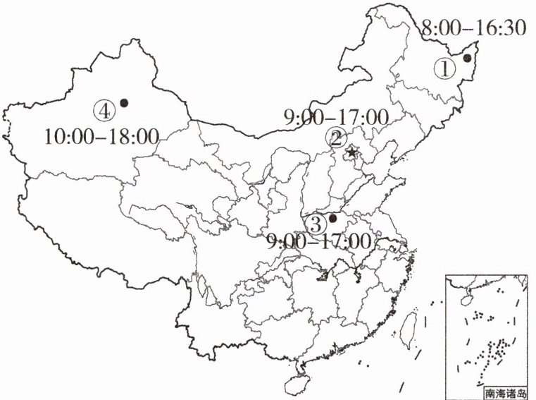 邮戳是邮局在信件、包裹等上加盖的戳记。下图为我国部分邮局的位置和营业时间示意图。读图回答7~8题。