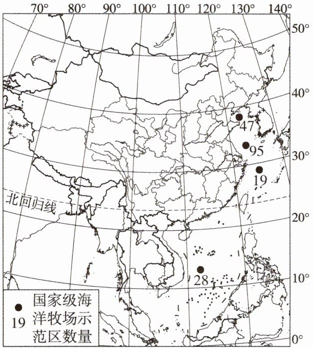 3.C 4.B [解析]第3题,我国南北跨纬度约50°,跨越热带、亚热带、北温带,气候差异大;我国领土最南端在曾母暗沙;渤海和琼州海峡是我国内海;我国大陆海岸线长约1.8万km,与8个国家隔海相望。第4题,读图可知,黄海国家级海洋牧场示范区数量最多。