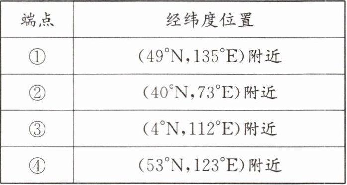 (2024·河南南阳卧龙区月考)下页表为我国领土四端点的经纬度位置。据此回答9~10题。