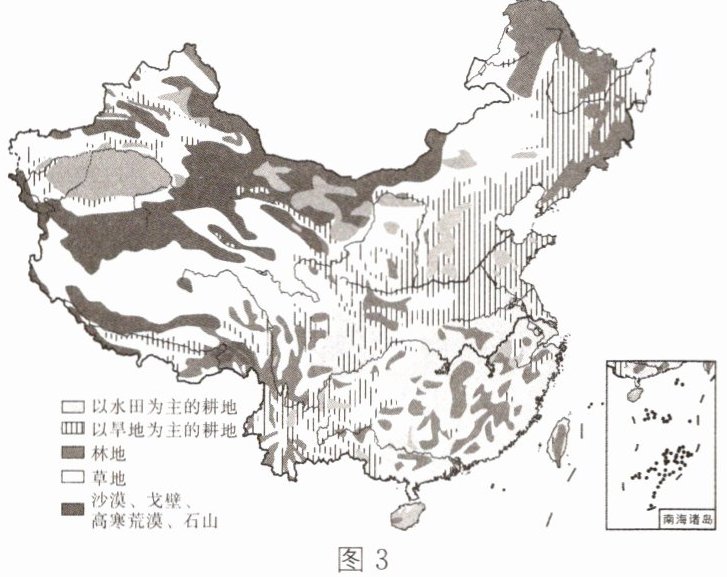 (4)据图3可知,耕地与草地的分界线大致是 (400/800)mm年降水量线。旱地集中分布在黄土高原、华北平原和 等地形区。