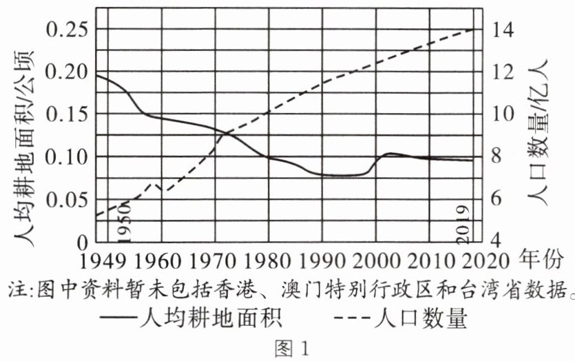 (1)题,读图可知,中国人均耕地面积在图中所示的相当长的一段时间呈下降趋势。人口总量总体在增长、不合理利用导致耕地退化以及退耕还林、还草政策的实施,导致耕地总量减少,因此人均耕地面积会下降,①②④正确;图中所统计的年份中,人口数量总体是增长的,粮食需求量随着人口的增长应当逐年上升,③错误。第