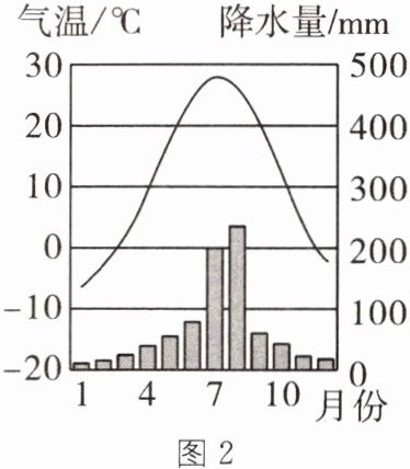 材料一 图1为中国径流带分布图,图2为山西省气温曲线和降水量柱状图。