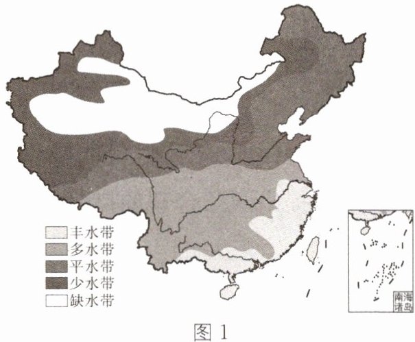 (1)题,我国季风气候显著,受降水的影响,我国水资源的空间分布特征是南丰北缺。读图可知,山西省所属的径流带是平水带。第