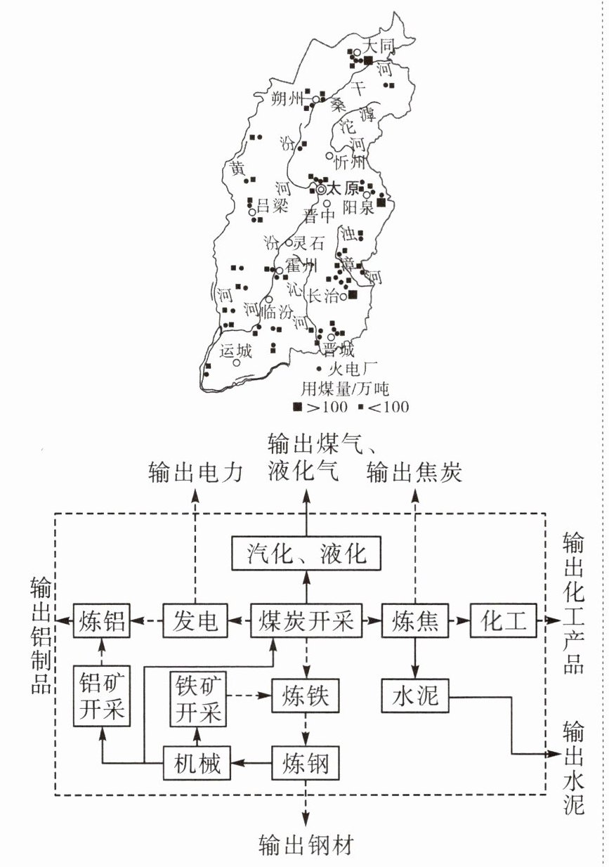 材料二 山西作为中国的“鲁尔区”,是我国最大的煤炭能源基地。近年来,通过煤炭的综合利用,氢能基地、新能源汽车产业园等的建设,山西正在将传统的煤炭资源优势转化为新能源发展优势,实现从能源原材料基地到现代装备制造及高技术产业基地的华丽蝶变。下图为山西煤炭分布图和山西煤炭综合利用示意图。