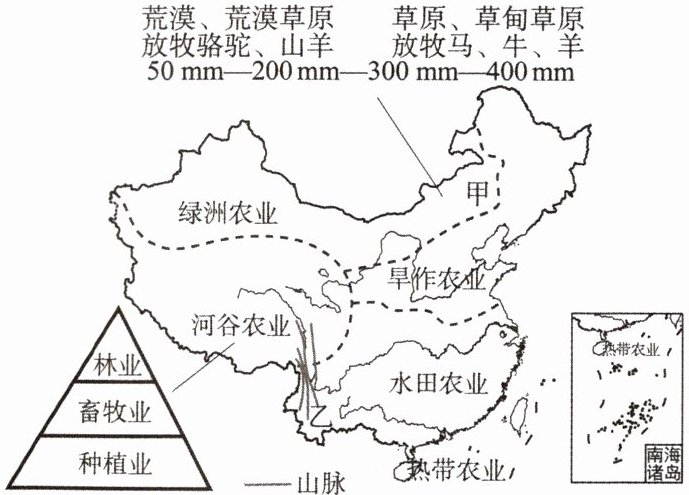 1 图中甲区域自东向西放牧的牲畜种类不同,主要是受( )