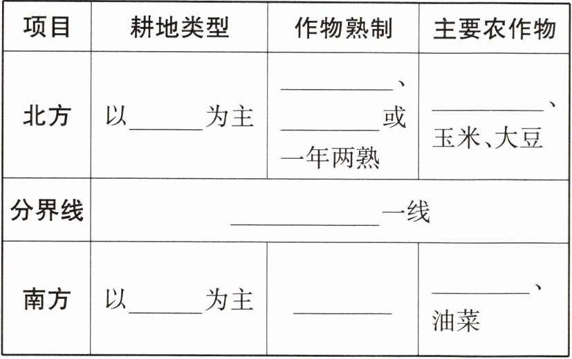 (1)(从左到右,从上到下)旱地 一年一熟 两年三熟 小麦 秦岭—淮河 水田 一年两熟或三熟 水稻