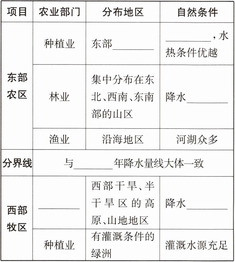 |西部牧区|______|西部干旱、半干旱区的高原、山地地区|降水______|