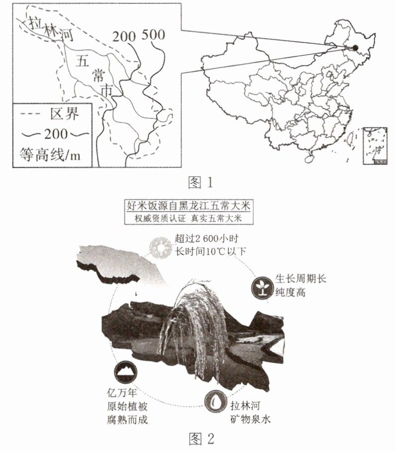 材料一 五常市(45°N)地处黑龙江省,属温带季风气候,昼夜温差高达20℃,黑土层厚达2 m,有机质高,土壤里富含对人体有益的矿物质和微量元素。五常大米颗粒饱满,饭粒香味浓郁,被称为“米中极品”,是著名的中国国家地理标志产品。图1为五常市地理位置和部分地理事物分布图,图2示意五常水稻生长的部分条件。