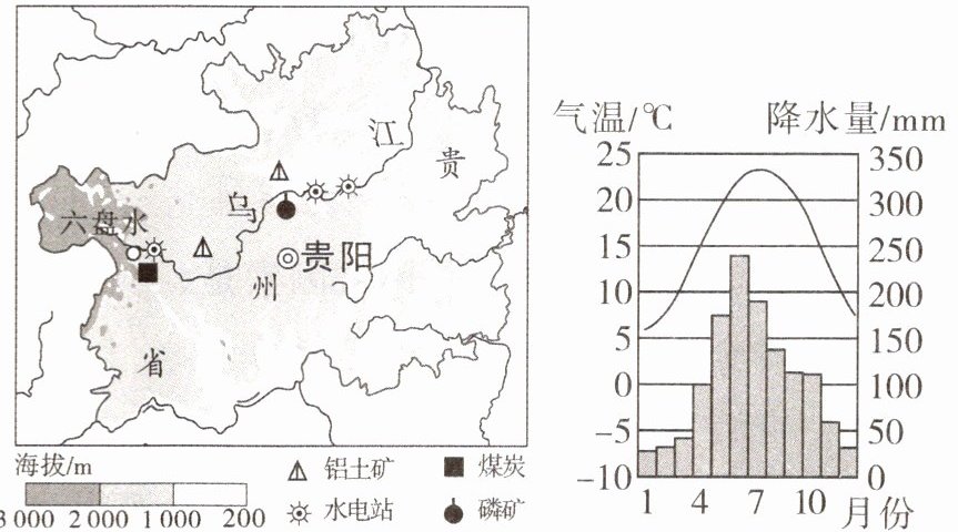 新情境 首开区·贵安新区机器人创新产业园 “东数西算”是将东部地区所产生的数据传输到西部地区进行存储和计算,促进东西部协同联动。2024年9月2日,“东数西算”贵安新区算力产业集群配套项目——首开区·贵安新区机器人创新产业园在贵安新区正式开园。自“东数西算”正式全面启动,贵州凭借其得天独厚的优势,成为全国首个国家大数据综合试验区。下图为贵州地形分布图和贵阳气候资料图。据此回答8~9题。