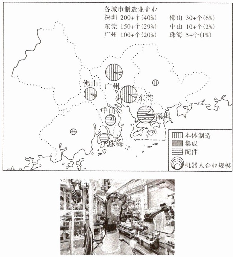 5.C 6.D 7.A [解析]第5题,由珠江三角洲工业机器人企业分布图可知,各城市的工业机器人企业,佛山30+个,东莞150+个,深圳200+个,广州100+个,因此工业机器人企业数量最多的是深圳。第6题,目前我国众多企业使用工业机器人,可以提高工业生产效率,降低企业劳动力成本;大规模推广工业机器人会减少普通工人就业机会,增加企业初始建厂资金支出。第7题,珠江三角洲地区制造业体量庞大、基础深厚,主要得益于高端人才的培养,与石油资源的输入、城镇化速度加快、远洋航海的发展无关。