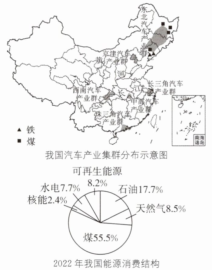 13 (2025·山东威海乳山期末)汽车工业是国家综合国力的缩影,60多年来我国汽车工业从无到有,从弱到强。发展新能源汽车是我国应对气候变化、推动绿色发展的战略举措。截至2024年,我国新能源汽车产销连续9年保持全球第一。读图回答下列问题。
