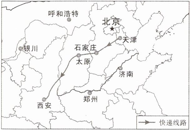 某同学在网上购买了一件物品。下图为该物品快递线路示意图。读图回答 5~6 题。