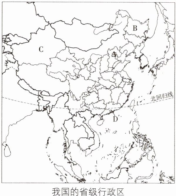 2 图中 A 是______市,B 是______省,C 是______自治区,D 是______特别行政区。