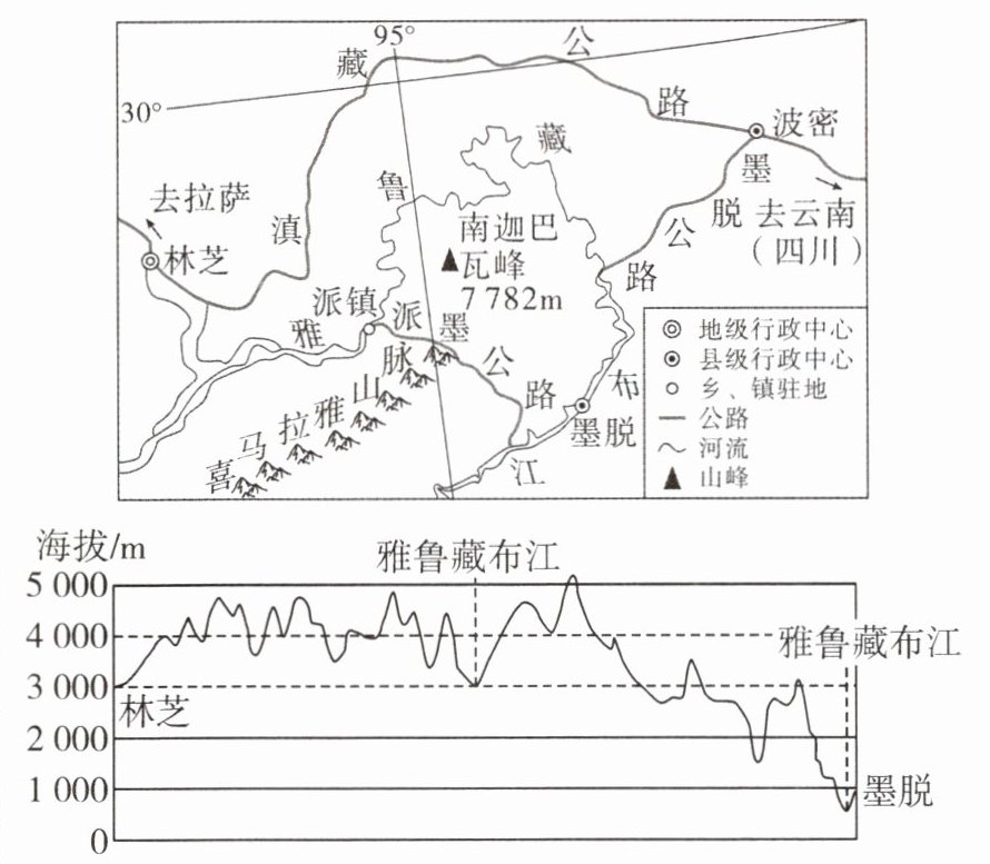 教材 P105 思与学·改编 墨脱在藏语中意为“隐藏的莲花”,其北、东、西三面高山相环,曾经是中国最后一个通公路的县,交通的闭塞使墨脱红米、柠檬、有机茶等特色农产品很难打开销路。2021 年 5 月 16 日派墨公路最后一个控制性节点工程老虎嘴隧道胜利贯通,比原计划工期提前 228 天,标志着历时近 7 年建设的派墨公路全线贯通。下图为墨脱附近公路分布图和林芝到墨脱地形剖面图。据此回答 9~11 题。
