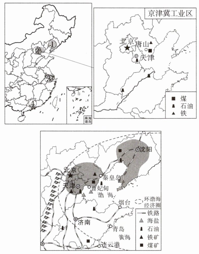 首都钢铁公司是中国特大型钢铁工业联合企业,长期以来为国家做出了巨大奉献,但也给北京带来了不少困扰,诸如环境污染、耗水量大、温室气体排放过多等。我国出台的《钢铁产业发展政策》明确指出:“从矿石、能源、资源、运输条件和国内外市场考虑,大型钢铁企业应主要分布在沿海地区。”首钢搬迁到河北省曹妃甸后,研发中心留在北京,首钢原址改造成工业遗址公园。下图为我国四大现代化工业区分布示意图和曹妃甸位置示意图。