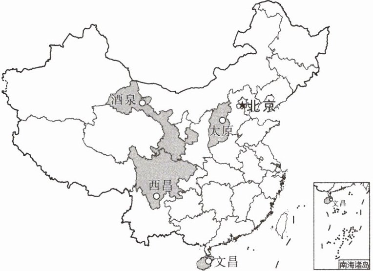 新情境 神舟二十号载人飞船发射成功 (2025·河南新乡月考)2025 年 4 月 24 日,神舟二十号载人飞船在酒泉卫星发射中心成功发射。读中国卫星发射基地分布图,回答 7~9 题。