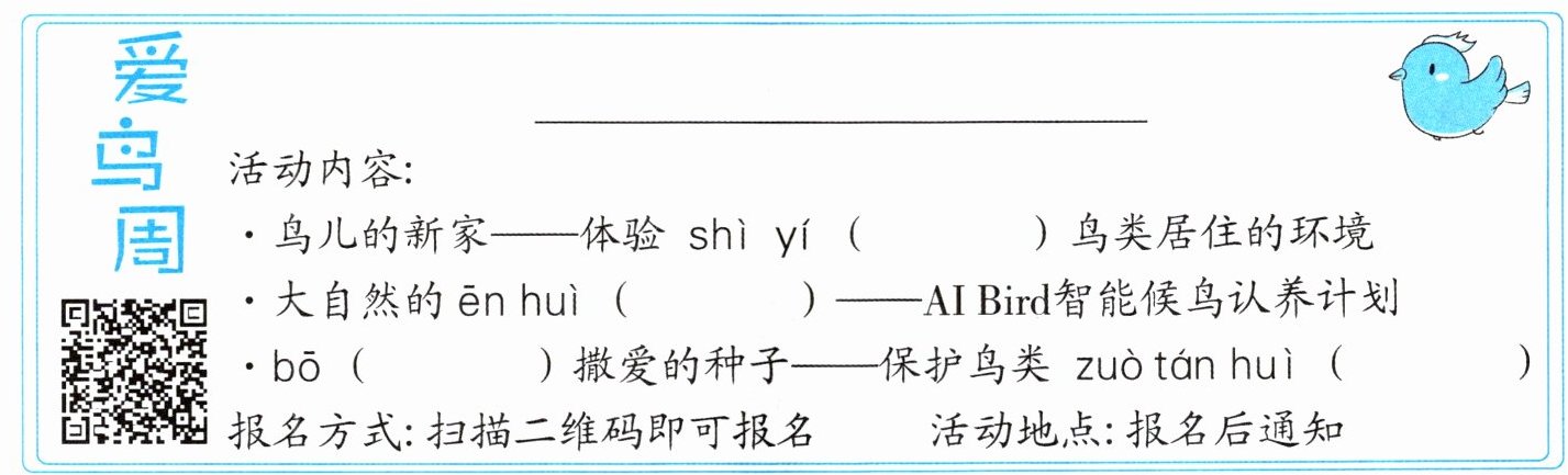 3. 木木,社区要开展“我与小鸟有个约会”志愿者日活动,扫码就可以报名,咱们一起参加吧!