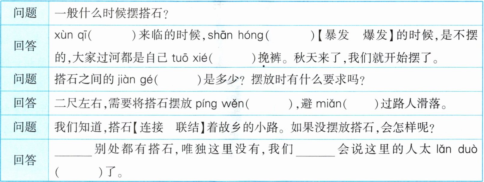 1. 汛期 山洪 脱鞋 间隔 平稳 免懒惰 2. B 3. 暴发 联结 4. 如果 就