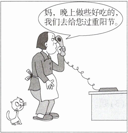 4. 答案 (示例)不能入选。“这就是尽孝心”漫画系列应该表现真正的孝心,而这幅漫画中的子女借口给母亲过重阳节,却不在行动上体谅、关爱母亲,反而要求母亲满足自己的需求,不能体现真正的孝心。 解析 由图可知,图中的儿女打电话给母亲,说要回家给母亲过重阳节,让母亲给他们做些好吃的。儿女们给母亲过节,却让母亲操劳,给自己做好吃的,不是真正的尽孝行为。所以这幅漫画不能入选。