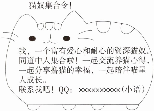 4.答案 (示例)我是小奇,热爱运动,渴望与志同道合的你相遇!无论是足球场上的默契配合,还是跑道上的并肩冲刺,我都满怀期待。如果你也热爱挑战,享受汗水带来的快乐,那就联系我吧! 一起探索运动的无限可能,共同书写属于我们的青春篇章。期待在绿茵场、跑道上,遇见同样热爱运动的你! 联系我吧! QQ:xxxxxxxxx(小奇)。解析 可以仿照示例《猫奴集合令!》来写征友启事,以小奇的口吻来写。先进行自我介绍,重点介绍自己的兴趣爱好(运动);然后向同学们发出邀请,找到志同道合的朋友,并交代交友的目的;结尾还要提供联系方式。尽量用生动形象、幽默风趣的语言来表达。