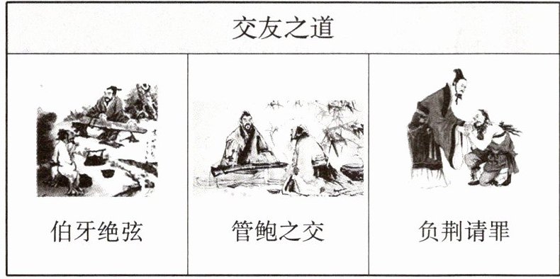 1.答案 ①要选择志趣相投的人做朋友。 ②朋友之间要互相理解,真诚相待。③朋友之间要懂得宽容。解析 ①“伯牙绝弦”讲述的是知音难求的故事,告诉我们要像俞伯牙与锺子期一样选择志趣相投的人做朋友。②“管鲍之交”是讲在管仲不得志时,鲍叔牙理解他、关心他,还向齐桓公举荐他。这个故事告诉我们朋友之间要互相理解,真诚相待。③“负荆请罪”这个故事告诉我们要像蔺相如那样宽容别人的过错,以大局为重。