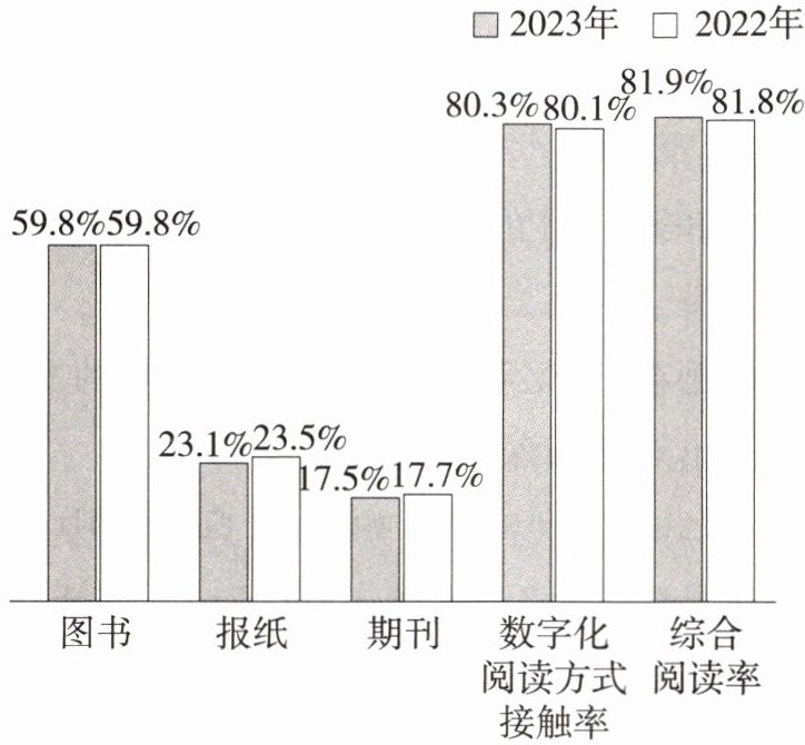 (示例)2023年与2022年相比,报纸、期刊的阅读率均有所下降,而数字化阅读方式接触率和综合阅读率有所上升。