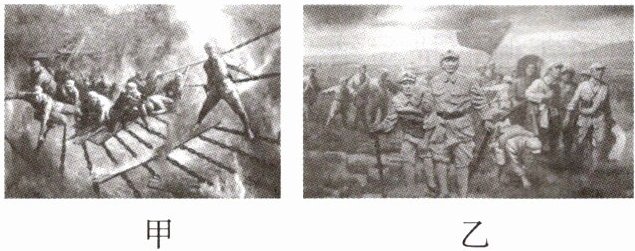 (1)(示例1)甲图。甲图描绘了红军战士飞夺泸定桥的经历。在这次战争中,战士们奋不顾身,冒着枪林弹雨,沿着桥面上的铁索向对岸的敌人进攻。战士们英勇无畏、不怕牺牲的精神体现了长征精神。(示例2)乙图。乙图描绘的是红军过草地的经历。红军经过的草地不是普通草地,而是高原湿地,泥泞不堪,沼泽遍布,战士们经历了行军难、吃饭难、宿营难等困难,有很多红军战士在这个过程中牺牲。战士们英勇无畏、不怕牺牲的精神体现了长征精神。(2)(示例1)我选彭德怀。他奉命从事谍报活动,到了长沙以后被叛徒出卖,遭到逮捕,在狱中他受尽各种刑罚,始终没有屈服招供,最终获释,表现出坚强不屈的品格。(示例2)我选朱德。他从军阀手中逃脱并被没收了个人财产,努力戒脱恶习,最终选择了革命之路并终生为之奋斗。(示例3)我选徐海东。他打仗十年,负伤八次,全身多处都受过伤,有一颗子弹从他眼下穿过他的脑袋又从耳后穿出,仍然坚持革命。