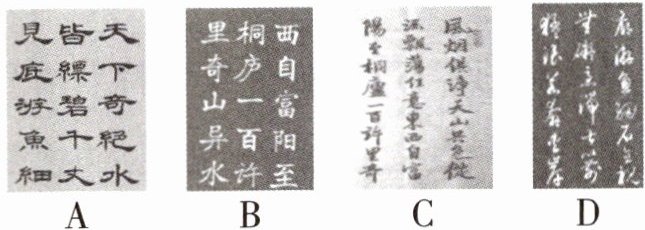 (2)A.形体宽扁,横长竖短,工整精巧,讲究“蚕头雁尾”,为隶书。B.字形端正,笔画平直,秀美圆润,为楷书。C.字形基本笔画类似于楷书,但书写出现明显的连笔,为行书。D.笔意连绵潇洒,一气呵成,狂放恣意,为草书。