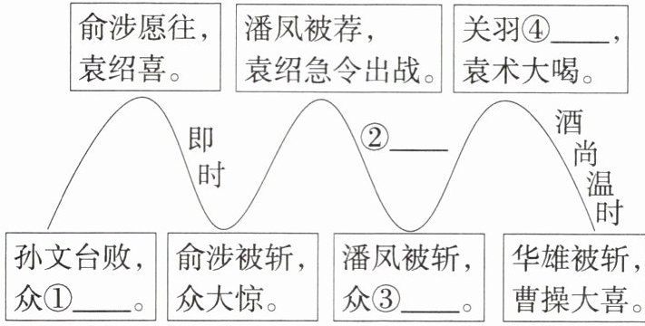解析 (1)①根据第①段“绍曰:‘前日鲍将军之弟不遵调遣……为之奈何?’诸侯并皆不语”,可概括为:皆不语。②根据第②段“潘风手提大斧上马。去不多时,飞马来报:‘潘风又被华雄斩了。’”,可概括为:去不多时。③根据第②段“飞马来报:‘潘风又被华雄斩了。’众皆失色”,可概括为:皆失色。④根据第②段“言未毕,阶下一人大呼曰:‘小将愿往斩华雄头,献于帐下!’”,可概括为:自荐。