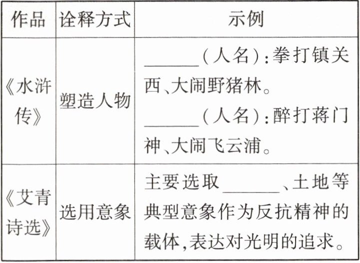 (1) 《水浒传》与《艾青诗选》两部作品分别以人物和意象诠释“反抗”主题。请你完善表中信息。