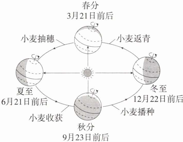 中考情境创设「2025广东东莞东城期中」某学校地理社团校园劳动札记:冬小麦在秋分之后就播种了。第二年春分之前,随着气温回升,小麦开始返青。五一前后,小麦开始抽穗。6月初,我们收获了沉甸甸的麦穗。下图为该社团同学在地球公转示意图中做的小麦生长阶段与相应位置的标注示意图,读图完成9—11题。