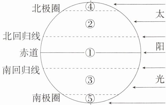 5.A ①地区位于热带,一年中有两次太阳直射;②③两地区位于温带,无极昼极夜现象,四季分明;④地区位于北寒带,气候终年寒冷;12月22日前后,⑤地区出现极昼现象。