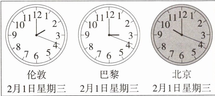「2025 山东青岛崂山期中」北京的刘先生因为工作需要经常到伦敦和巴黎出差,为方便联系客户,直接读取当地当时的时间,他在自己的手机界面上设置了一个城市时间差异图(如下图所示),其中白色表盘显示的是当地的白天时间,灰色表盘则为夜晚时间。读图完成 4—5 题。