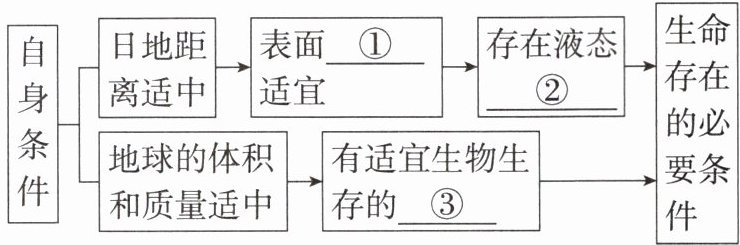 (2)地球是人类赖以生存和发展的唯一家园,分析地球自身条件填写下面框图。(6分)