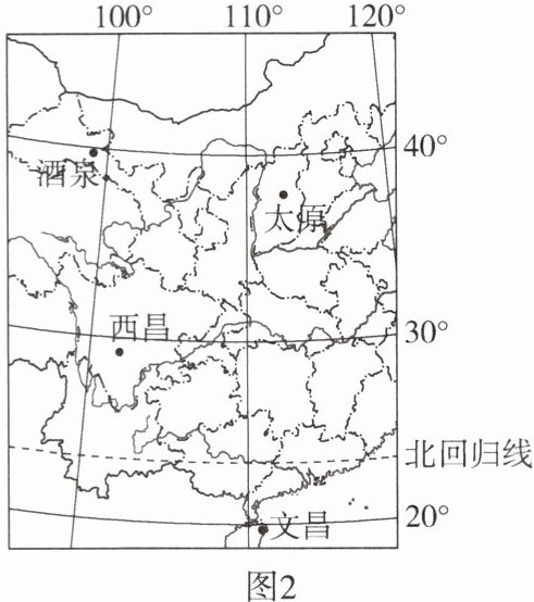 (3)我国四大卫星发射基地中,酒泉卫星发射基地位于____(温度带);距离济南(37°N,117°E)最近的是____卫星发射基地;纬度最低的是____卫星发射基地,更有利于航天器的发射。根据经纬网定向法,酒泉卫星发射基地在文昌卫星发射基地的____方向。(8分)