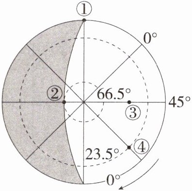 13.A 读图可知,自转方向为顺时针方向,则该图为南极上空俯视图,图中纬度为南纬;两条相邻经线的经度差为45°,经度随着地球自转方向增大为东经,④地的经纬度位置是(23.5°S,90°E)。