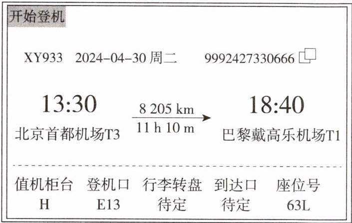 中考情境「2024山东济南中考」某同学跟随家人到法国旅行,拿到一张“有趣”的电子机票(下图)。据此完成9-10题。