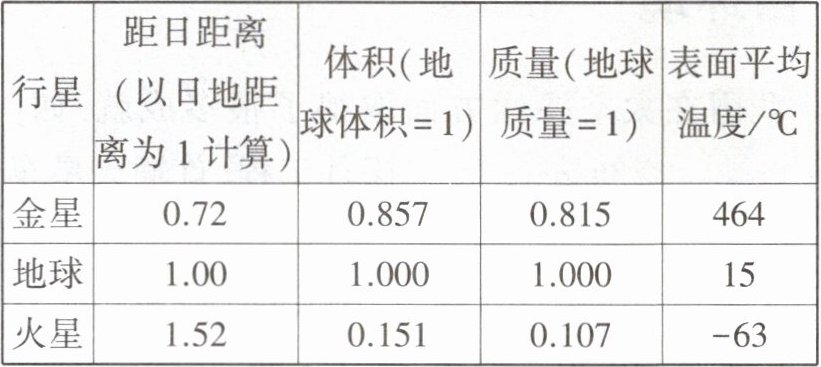 |行星|距日距离(以日地距离为1计算)|体积(地球体积= 1)|质量(地球质量= 1)|表面平均温度/℃|