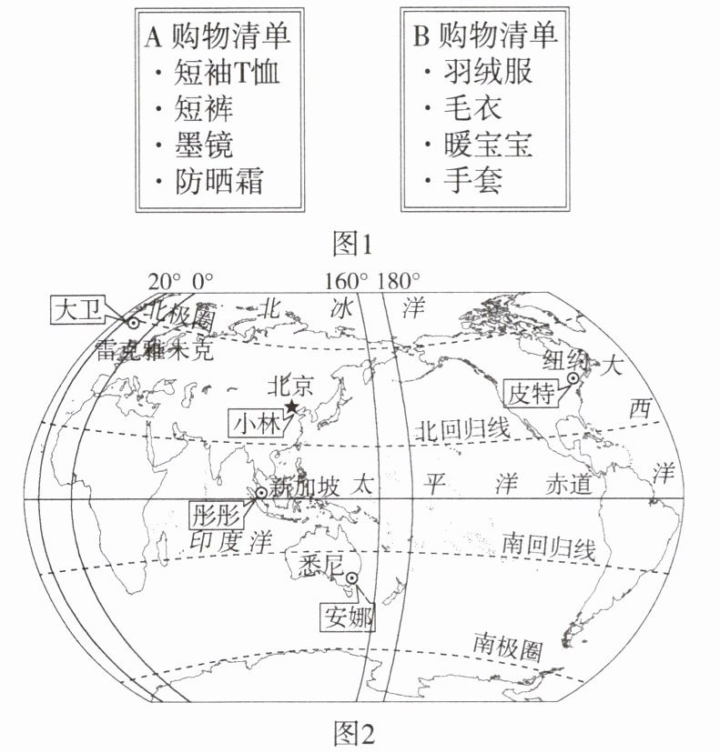 解析 (1)11月11日,太阳直射点在南半球,北半球昼短夜长,北极圈以内部分地区有极夜现象。北京位于东八区,纽约位于西五区,北京和纽约的时差是13小时,11月11日北京时间零点时纽约时间为11月10日11时,故皮特不用熬夜抢购,这是由于地球的自转导致的时间差异。(2)参与此次网购活动中的安娜同学来自澳大利亚的悉尼,位于南半球;大卫同学所在的城市靠近北极圈,纬度最高;彤彤同学来自新加坡,位于热带。(3)11月11日,太阳直射点在南半球,北半球昼短夜长,北京位于北半球,此时为秋季。2023年12月22日是冬至日,太阳直射南回归线(23.5°S)。(4)结合图示信息,安娜同学来自澳大利亚的悉尼,南北半球季节相反,此时安娜所在地正值夏天,天气炎热,气温高,应该购买短袖T恤、短裤、墨镜、防晒霜等物品,即A购物清单的物品。
