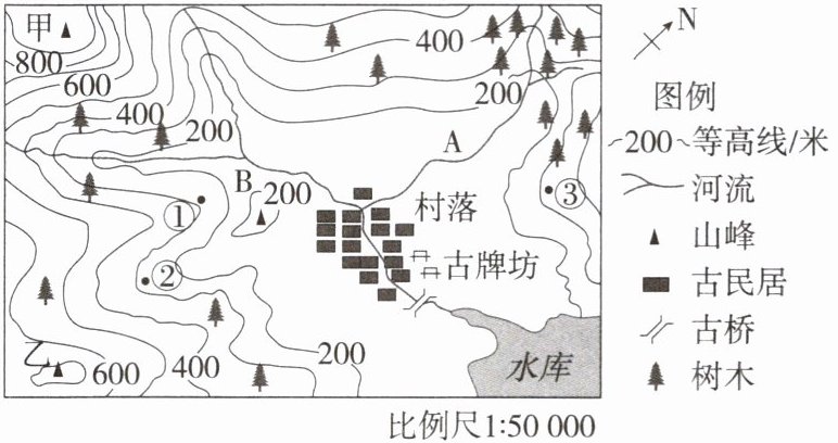 13.「2024山东东营中考」下图为我国南方某古村落及周边地区等高线地形图,这里的古牌坊、古民居具有浓郁的地方特色,吸引了大量游客。读图回答下列问题。