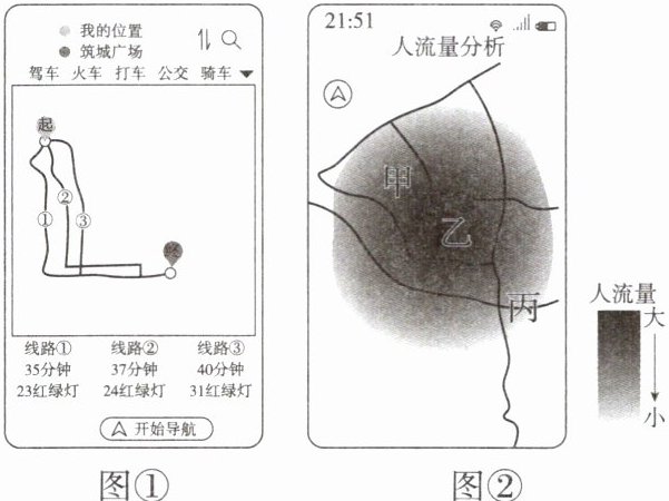 (1)据图可知,图①中出发点与目的地之间,规划了三条线路,图②为人流量分析图。要了解某地某时刻的人口分布情况,应选择图②。据图可知,颜色越深,表示此时人流量越大,乙地颜色最深,故乙地此时人流量最大。结合时间分析,此时为夜晚21:51,人们大多待在家里,住宅区是人们长期居住的地方,该时段人口较多,相比之下,公园主要功能是休闲和娱乐,该时段人口较少。