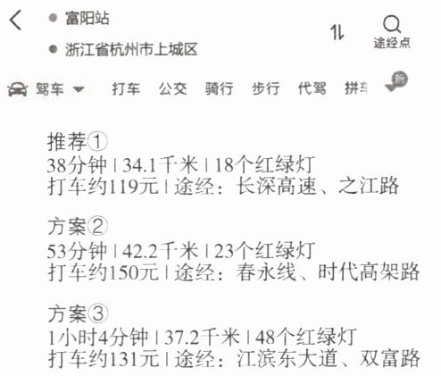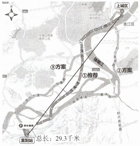 「2024山东泰安中考」随着科技的进步,车载导航给人们的出行带来了极大的便利。小宇的爸爸乘出租车从杭州富阳站到上城区,下面是车上的车载导航地图。读图完成11—12题。