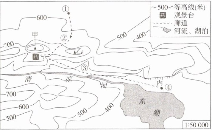 6.B 读图可知,该区域地势西高东低,清凉河自西向东流淌;丙处等高线重合为陡崖,可以开展攀岩活动,可能见到攀岩训练基地;图中比例尺为1∶50 000,甲、乙两山峰之间的图上距离约为1厘米,则实地直线距离约为500米;由记录卡片可知,太阳在记录地点的东北方位升起,且4:30日出,该地昼长夜短,此时应属于夏季。