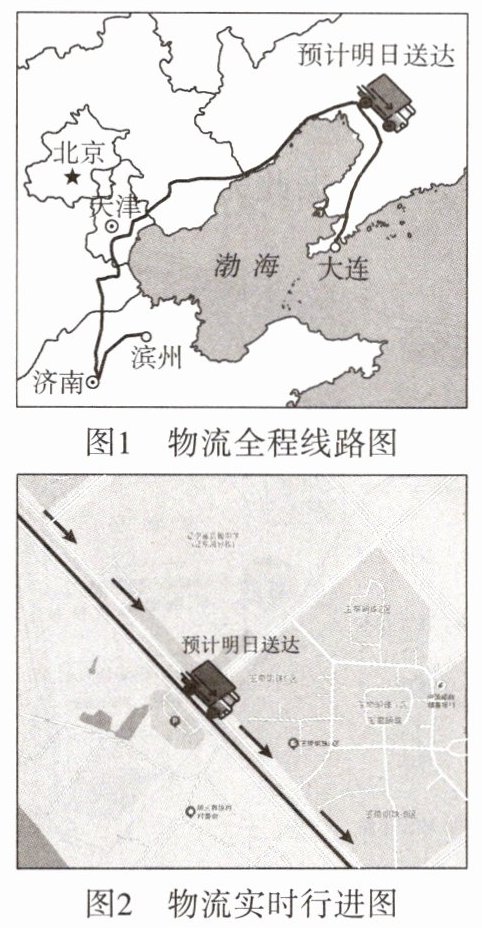 [2025 辽宁大连甘井子期中]十一期间家住大连的小明网购了来自山东的特产商品,他通过手机软件查询了物流送达情况。读图完成 1—2 题。