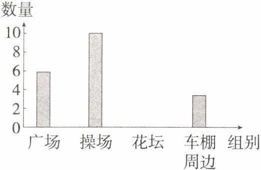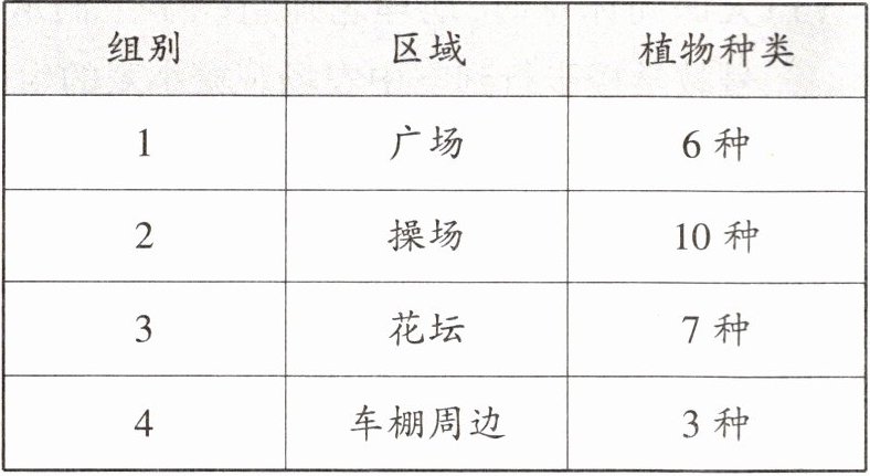 福州某学校七年级(1)班的40位学生随机分成4个小组,分别对学校的广场、操场、花坛、车棚周边四个区域开展植物种类大调查,统计结果如下表所示。