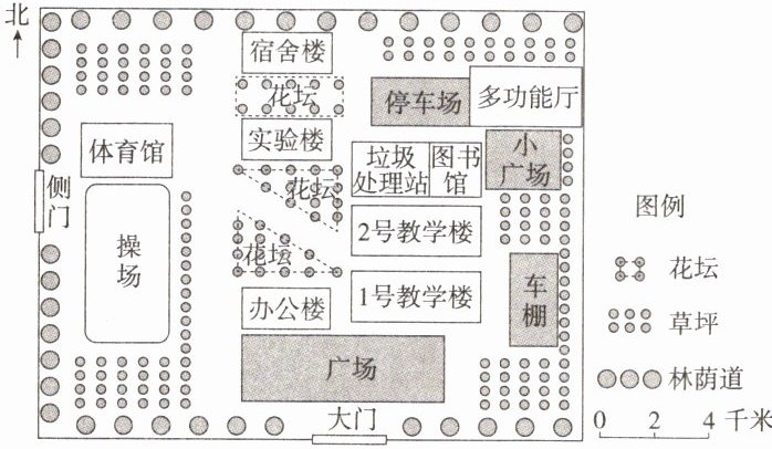 为了尽快熟悉校园绿化情况,阅读校园平面图,完成以下任务。