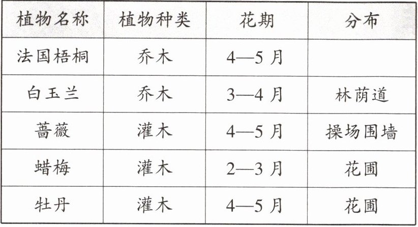 3.某中学老师带领学生开展以“美化校园”为主题的探究学习活动。下图为该中学校园平面图,结合图表材料,回答下列问题。
