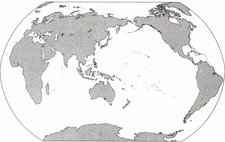 20世纪90年代,瑞士人皮尔卡和英国人琼斯从阿尔卑斯山脉上空出发,先飞向非洲北部,然后飞跃东南亚、太平洋、美洲中部、大西洋,最后降落在北非的埃及。两位探险家历时20天,总计飞行42810千米,完成了乘热气球环球飞行的壮举。下图示意世界海陆分布。