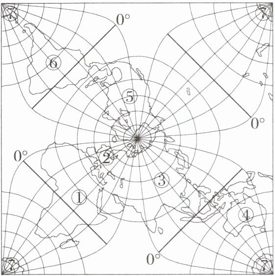 「2025河北邢台信都月考改编」皮尔斯梅花投影(图)是以北极为中心,将地球表面展现在平面上的一种地图投影。据此完成5—7题。