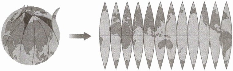 「2025广东东莞东城期中」把地球仪上的地图像剥橘子一样“剥开”,展开为12瓣橘子一样的平面地图。读图完成1—2题。